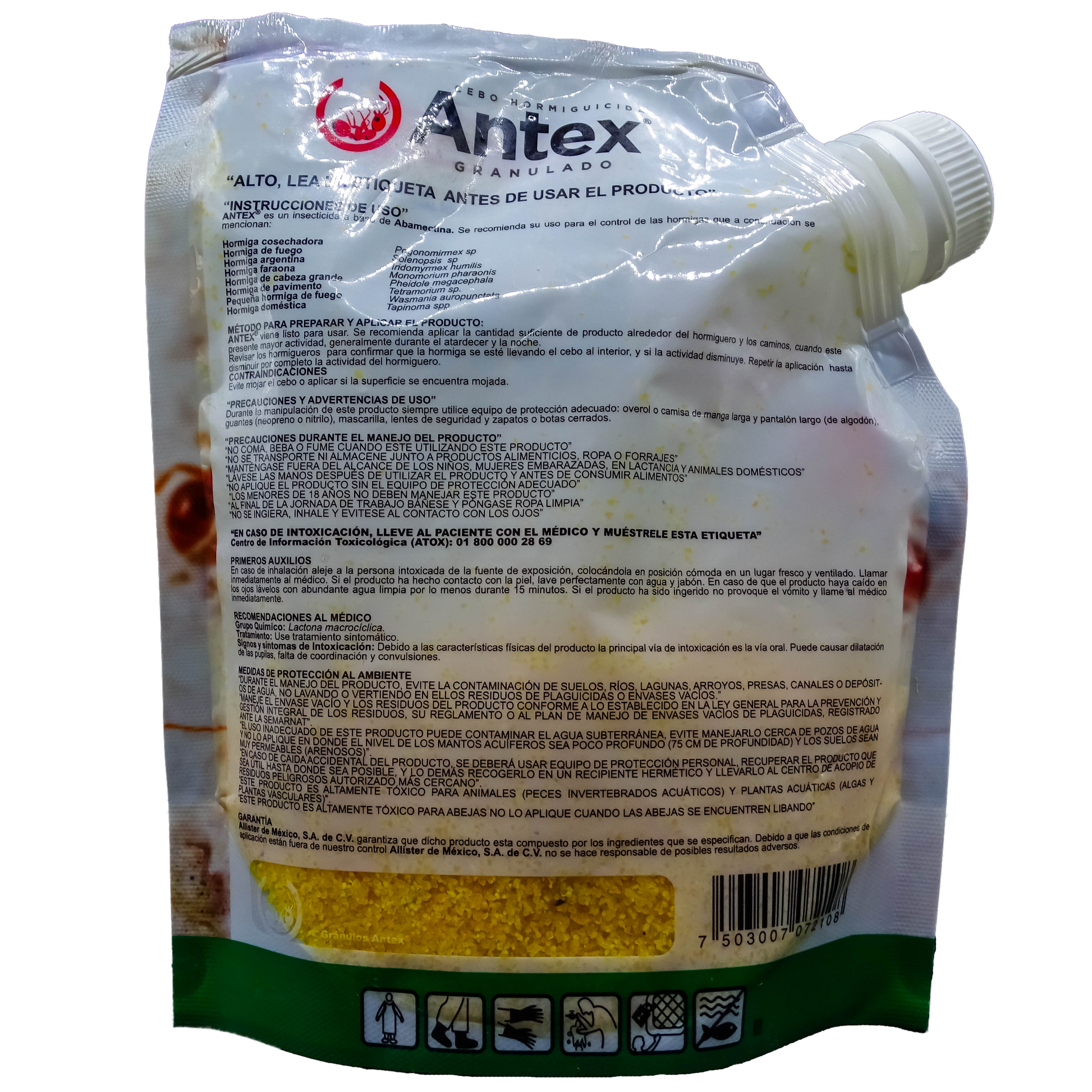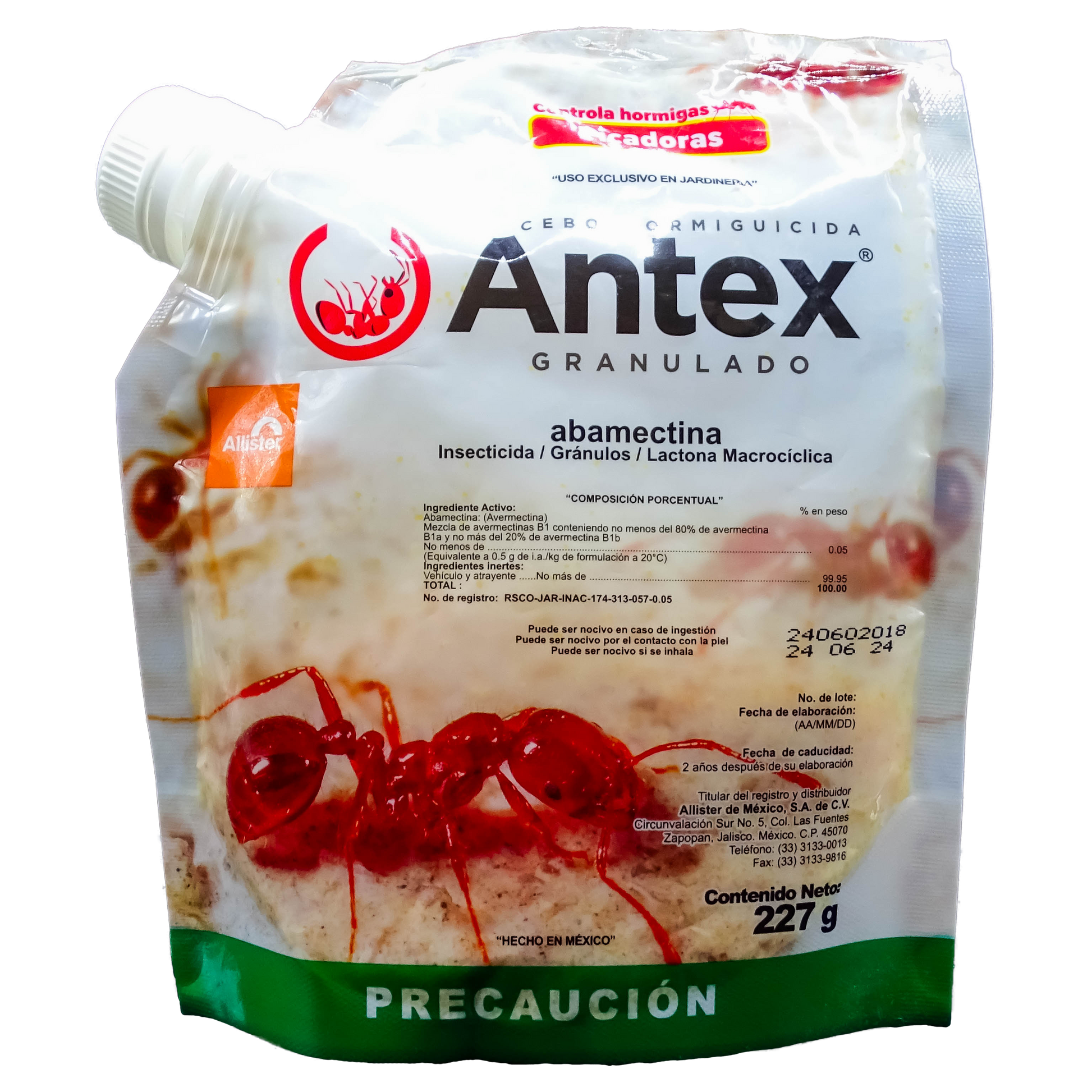 Antex Granulado es un hormiguicida en forma de gránulos formulado a partir de ingredientes naturales y atractivos para las hormigas, como la abamectina. Su mecanismo de acción consiste en que las hormigas lo transportan al nido, lo que les permite alimentarse de él y transmitirlo a toda la colonia, incluyendo a la reina, lo que finalmente acaba con el hormiguero. Es un producto biodegradable, seguro para personas y animales domésticos, y que no contamina el suelo.
