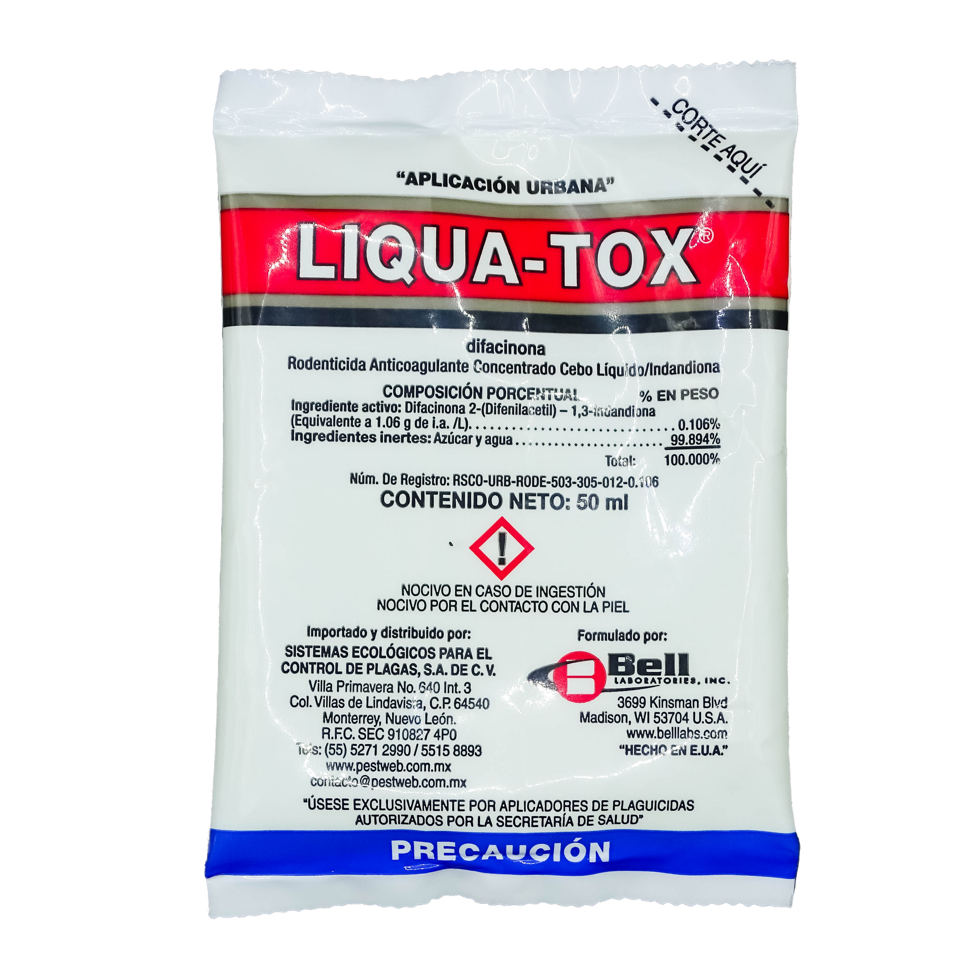 Liquatox es un rodenticida líquido concentrado, fabricado por Bell Laboratories, cuya sustancia activa es la difacinona sódica, un anticoagulante que provoca hemorragias internas en ratas y ratones. Su presentación líquida se mezcla con agua para crear un cebo que atrae a los roedores, quienes suelen buscar fuentes de agua y alimento en su entorno. Es especialmente útil en ambientes con competencia de alimentos o escasez de agua, como almacenes, y debe colocarse en estaciones de cebo seguras y fuera del alcance de niños y mascotas.